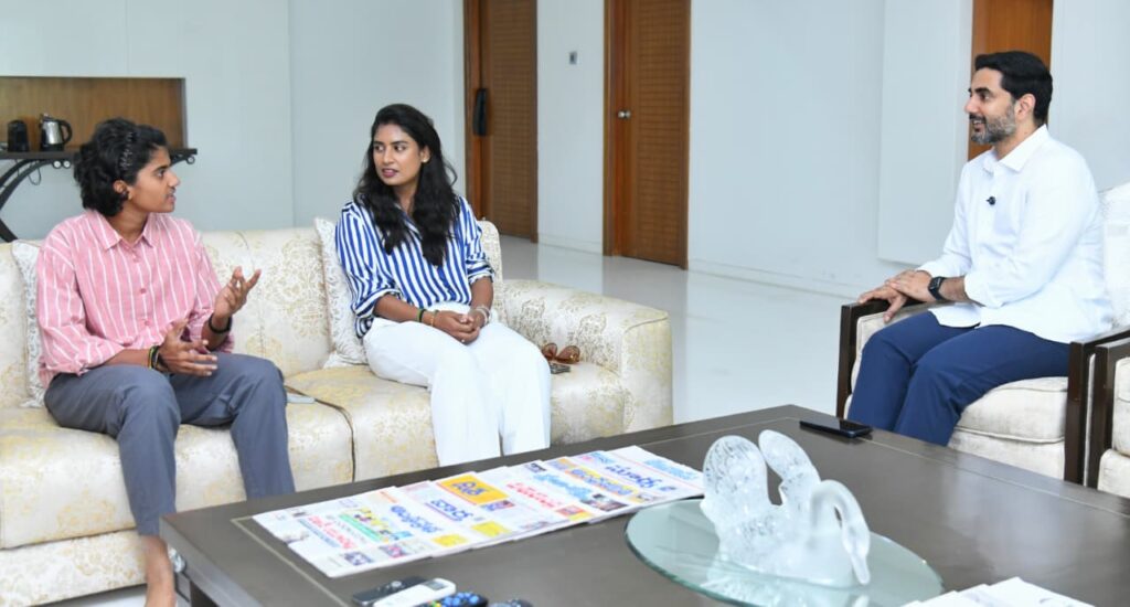 కడప జిల్లా కు చెందిన ఉమెన్ క్రికెటర్ శ్రీచరణి, మాజీ కెప్టెన్ మిథాలీ కలిశారు . భారత మహిళా క్రికెట్ జట్టులో చోటు దక్కించుకొని రాష్ట్రానికి గౌరవం తీసుకొచ్చింది. ఆమె ప్రదర్శనతో WPL వేలం మరియు జాతీయ స్థాయి మ్యాచ్లలో కీలక పాత్ర పోషించింది.తాజాగా, శ్రీచరణి సీఎం క్యాంప్ కార్యాలయంలో ముఖ్యమంత్రి నారా చంద్రబాబు నాయుడు గారిని, మంత్రి నారా లోకేష్ గారిని కలిశారు . ఈ సందర్భంగా మాజీ భారత మహిళా జట్టు కెప్టెన్ మిథాలీ రాజ్ కూడా హాజరయ్యారు.ముఖ్యమంత్రి చంద్రబాబు నాయుడు శ్రీచరణిని అభినందిస్తూ, భవిష్యత్తులో అంతర్జాతీయ స్థాయిలో మరిన్ని విజయాలు సాధించాలని ఆకాంక్షించారు. రాష్ట్ర ప్రభుత్వం ఆమె ప్రతిభను ప్రశంసిస్తూ ప్రోత్సాహక చర్యలు తీసుకోవాలని మంత్రి లోకేష్ తెలిపారు.