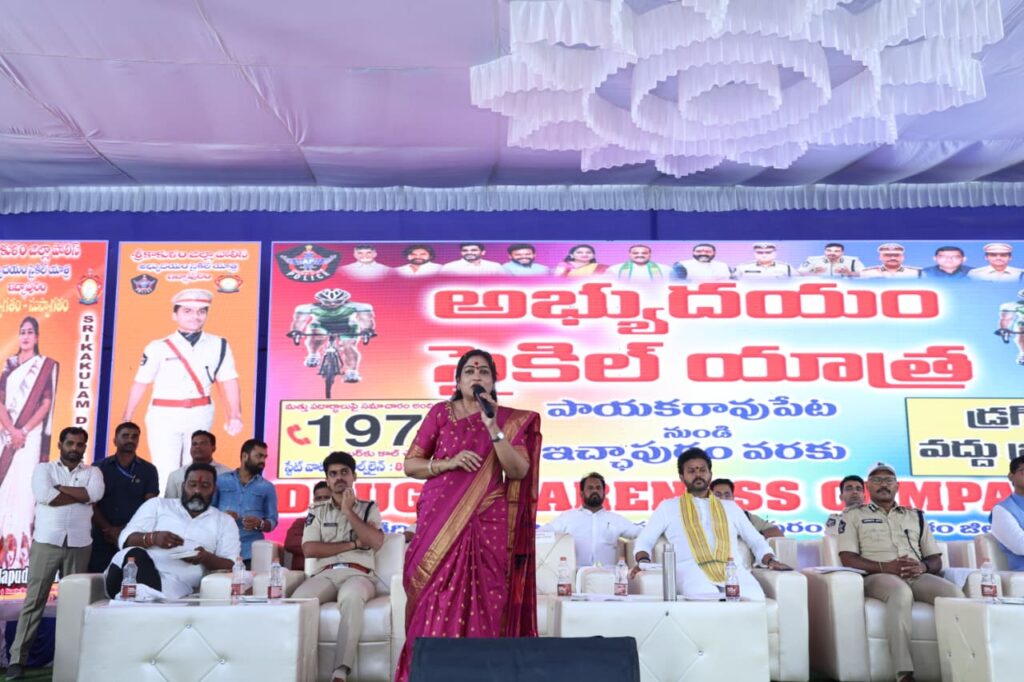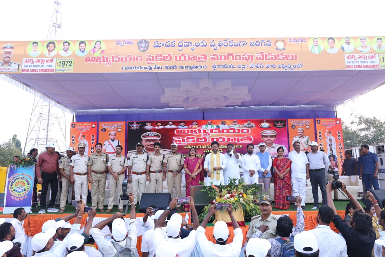 ఆంధ్రప్రదేశ్ను మాదకద్రవ్యాల రహిత రాష్ట్రంగా మార్చే లక్ష్యంతో విశాఖ రేంజ్ పోలీసు యంత్రాంగం చేపట్టిన ‘అభ్యుదయం’ సైకిల్ యాత్ర శనివారం ఇచ్చాపురంలో ఘనంగా ముగిసింది. 53 రోజుల పాటు 1300 కిలోమీటర్ల మేర సాగిన ఈ చైతన్య యాత్ర ముగింపు సభలో కేంద్ర మంత్రి కింజరాపు రామ్మోహన్ నాయుడు, రాష్ట్ర హోం మంత్రి వంగలపూడి అనిత పాల్గొన్నారు.యాత్ర ముగింపు సందర్భంగా ఏర్పాటు చేసిన ప్రత్యేక పైలాన్ను మంత్రులు ఆవిష్కరించారు.
