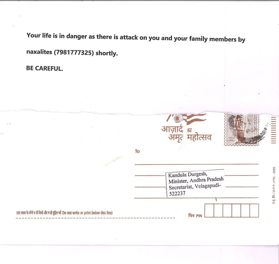 ఆంధ్రప్రదేశ్ పర్యాటక, సాంకేతిక శాఖ మంత్రి కందుల దుర్గేష్ కు గుర్తుతెలియని వ్యక్తుల నుండి ప్రాణహాని తలపెడతామంటూ బెదిరింపు లేఖ రావడం సంచలనం సృష్టించింది. ఒక సాధారణ పోస్ట్ కార్డుపై మావోయిస్టుల పేరుతో వచ్చిన ఈ లేఖ సచివాలయంలోని మంత్రి పేషీకి చేరింది. మంత్రి కందుల దుర్గేష్తో పాటు ఆయన కుటుంబ సభ్యులను కూడా హతమారుస్తామంటూ లేఖలో తీవ్ర హెచ్చరికలు జారీ చేశారు.