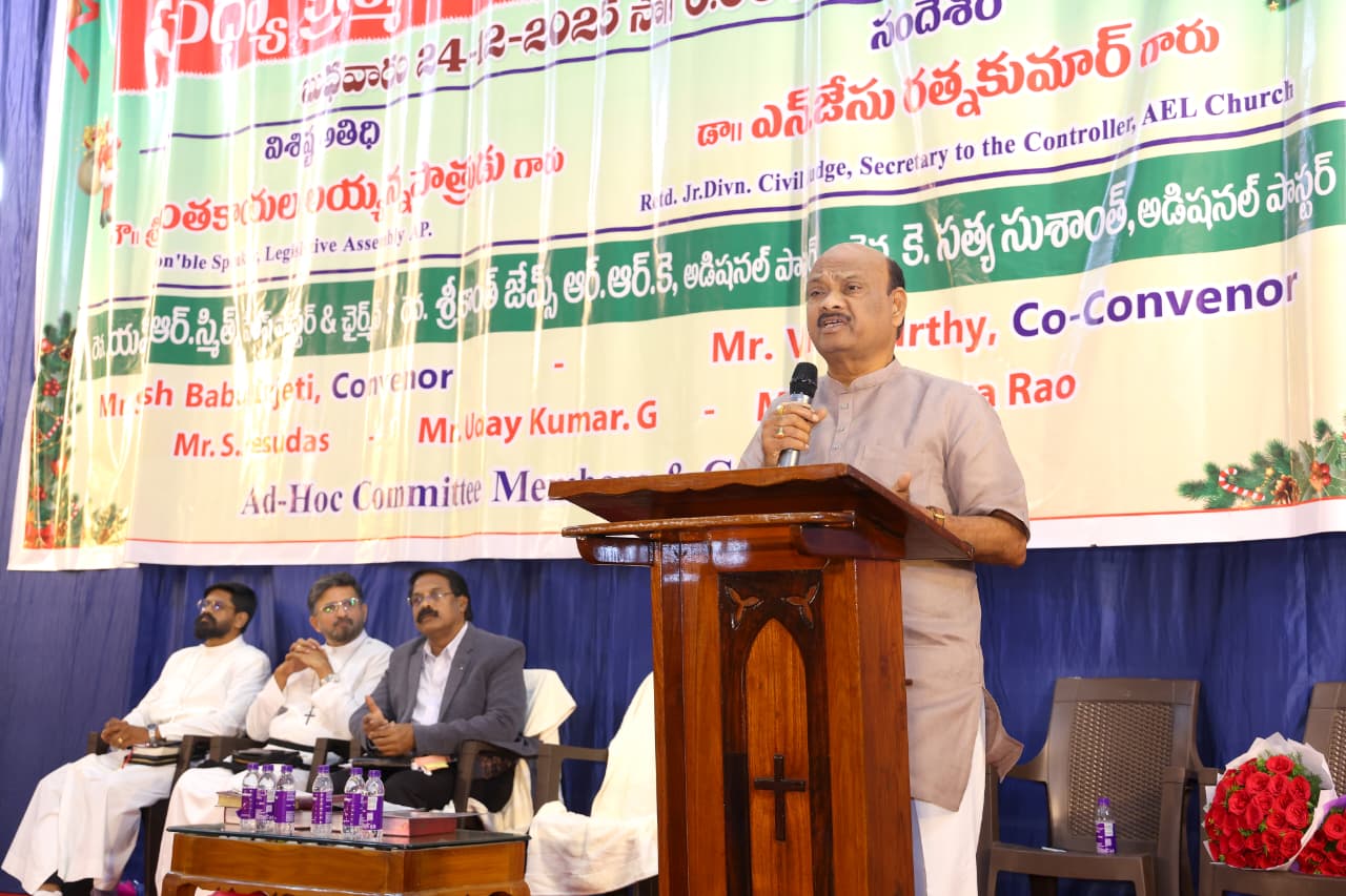 ప్రేమ, క్షమ, త్యాగం అనే విలువలే క్రిస్మస్ పండుగ సందేశమని ఆంధ్రప్రదేశ్ శాసనసభ స్పీకర్ చింతకాయల అయ్యన్నపాత్రుడు పేర్కొన్నారు. బుధవారం సాయంత్రం సూర్యాబాగ్ ప్రాంతంలోని ట్రినిటీ లూథరన్ చర్చిలో జరిగిన క్రిస్మస్ వేడుకల్లో ఆయన ముఖ్య అతిథిగా పాల్గొన్నారు. యేసుక్రీస్తు పశువుల పాకలో జన్మించడం ద్వారా అహంకారం కంటే వినయమే గొప్పదని ప్రపంచానికి చాటారని స్పీకర్ కొనియాడారు. ముఖ్యమంత్రి చంద్రబాబు నాయుడు నేతృత్వంలోని కూటమి ప్రభుత్వం క్రైస్తవ సంక్షేమానికి కట్టుబడి ఉందని, చర్చిల నిర్మాణం మరియు పండుగ కానుకల విషయంలో ఎల్లప్పుడూ అండగా ఉంటుందని హామీ ఇచ్చారు. రాష్ట్రం సుభిక్షంగా ఉండాలని, ప్రజలందరి జీవితాల్లో కొత్త వెలుగులు నింపాలని ఆయన ఆకాంక్షించారు. ఈ వేడుకల్లో డాక్టర్ ఎన్. జేసు రత్నకుమార్, చర్చి పాస్టర్లు, కన్వీనర్ సుష్ బాబు, కో-కన్వీనర్ వి.ఎన్. మూర్తి మరియు పెద్ద సంఖ్యలో క్రైస్తవ సోదరులు పాల్గొన్నారు.