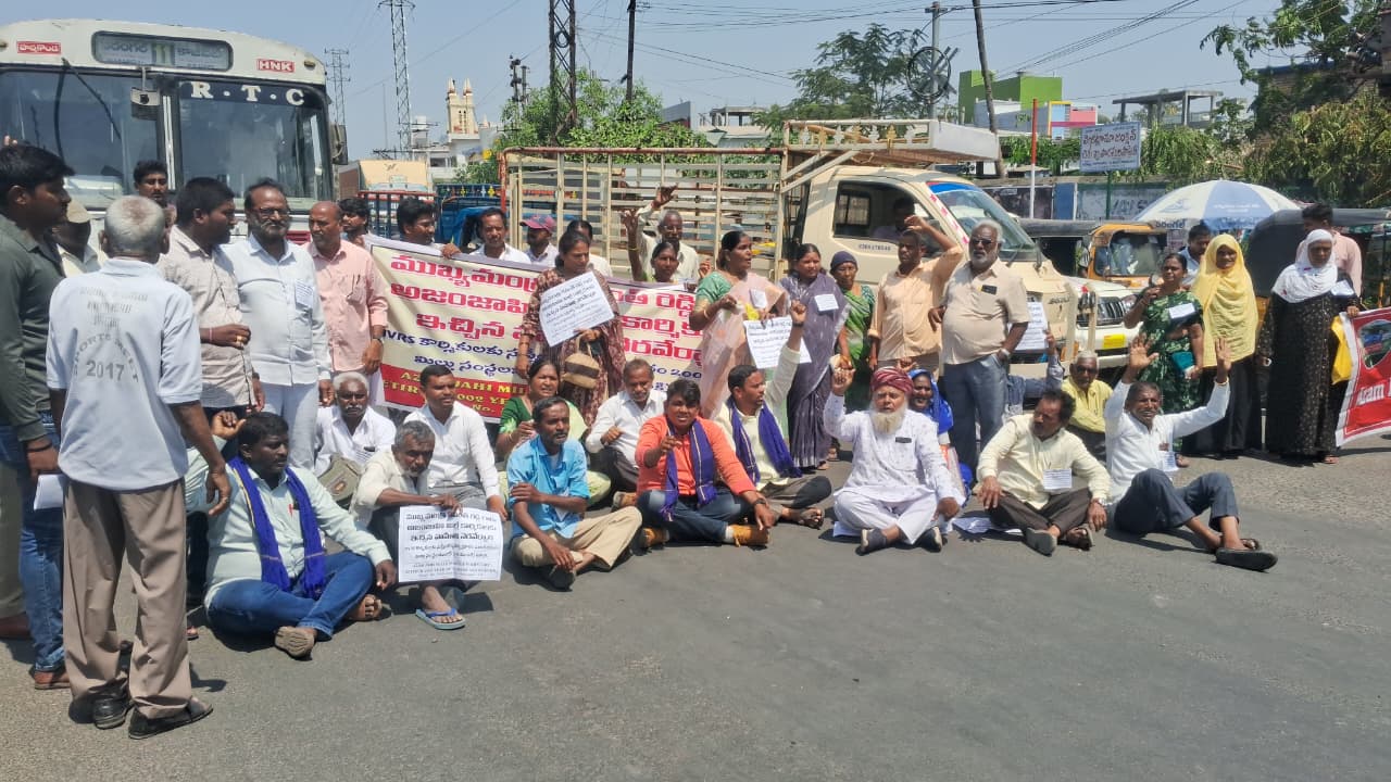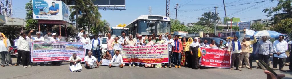 Warangalలోని Venkatrama Junction వద్ద ఆజాం జాహి మిల్లు కార్మికులు రోడ్డుపై బైఠాయించి ధర్నా చేపట్టారు. A. Revanth Reddy ఇచ్చిన హామీలను వెంటనే అమలు చేయాలని వారు డిమాండ్ చేశారు.
