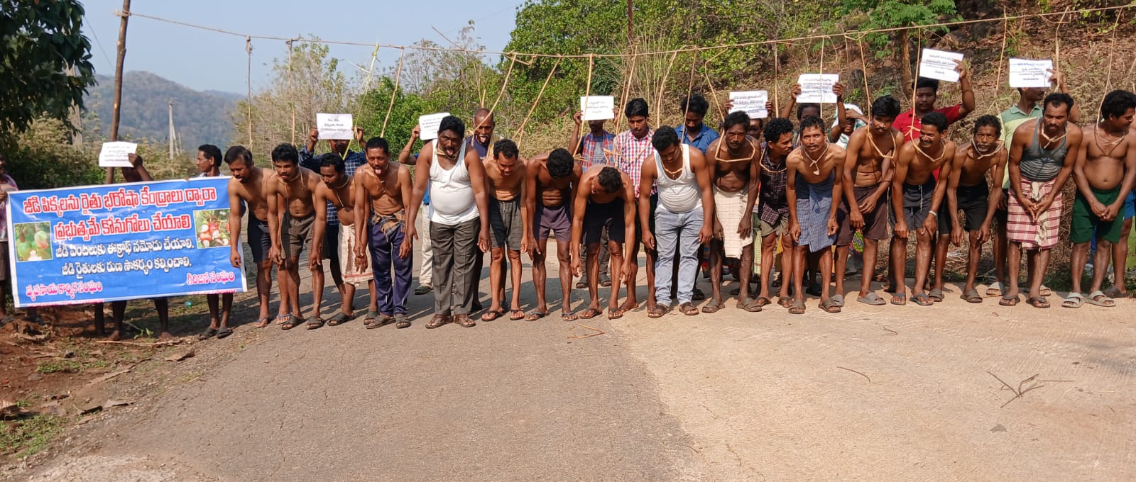 అకాల వర్షాలు, మంచు తెగుళ్ల కారణంగా తీవ్రంగా నష్టపోయిన జీడీ రైతులు ఉరి తాళ్లతో నిరసన చేపట్టారు. వాలాబు పంచాయతీలో గిరిజన రైతులు అర్ధనగ్నంగా మెడకు ఉరి తాళ్లు వేసుకుని ప్రభుత్వంపై ఆగ్రహం వ్యక్తం చేశారు.రైతులు మాట్లాడుతూ, ఈ ఏడాది జీడీ పంట పూర్తిగా దెబ్బతిన్నదని, సంవత్సరాంతం ఈ పంటపైనే ఆధారపడే గిరిజన కుటుంబాలు అప్పుల పాలయ్యాయని ఆవేదన వ్యక్తం చేశారు. ఎకరానికి రూ.30 వేల చొప్పున నష్టపరిహారం చెల్లించాలని డిమాండ్ చేశారు.