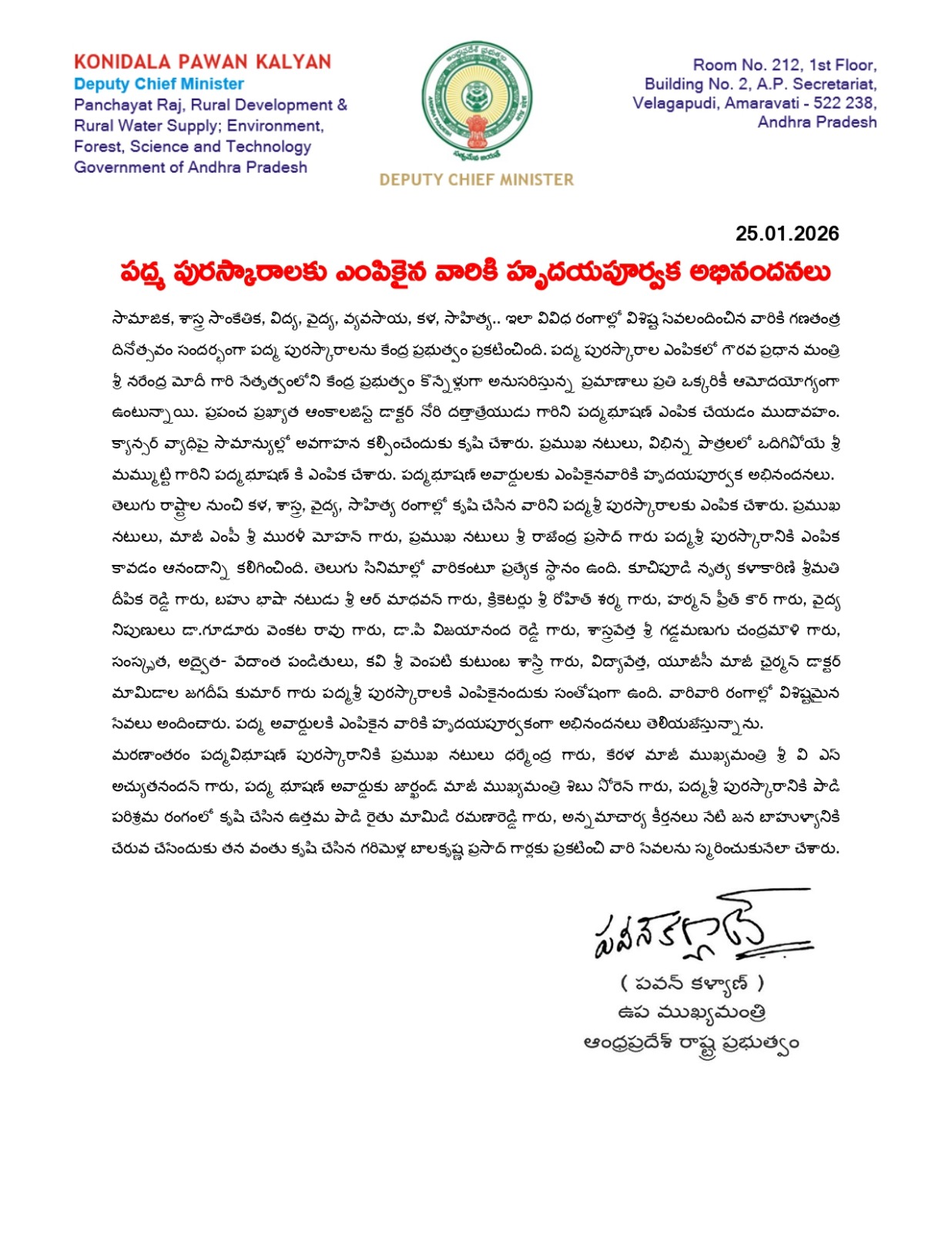 ప్రముఖ క్యాన్సర్ వైద్యుడు డాక్టర్ నోరి దత్తాత్రేయుడుకు పద్మభూషణ్ రావడంపై సీఎం ప్రత్యేకంగా అభినందించారు. యూజీసీ మాజీ ఛైర్మన్ మామిడాల జగదీశ్ కుమార్, ప్రముఖ నటులు రాజేంద్ర ప్రసాద్, మురళీ మోహన్, గాయకులు గరిమెళ్ల బాలకృష్ణ ప్రసాద్ (మరణానంతరం) సహా ఇతర ప్రముఖులకు పద్మశ్రీ దక్కడం తెలుగు జాతికి గర్వకారణమని పేర్కొన్నారు. వివిధ రంగాల్లో విశేష సేవలు అందించిన ఈ మహనీయుల కృషి భావితరాలకు స్ఫూర్తినిస్తుందని, తెలుగు జాతి ఖ్యాతిని ప్రపంచవ్యాప్తం చేశారని సీఎం కొనియాడారు.