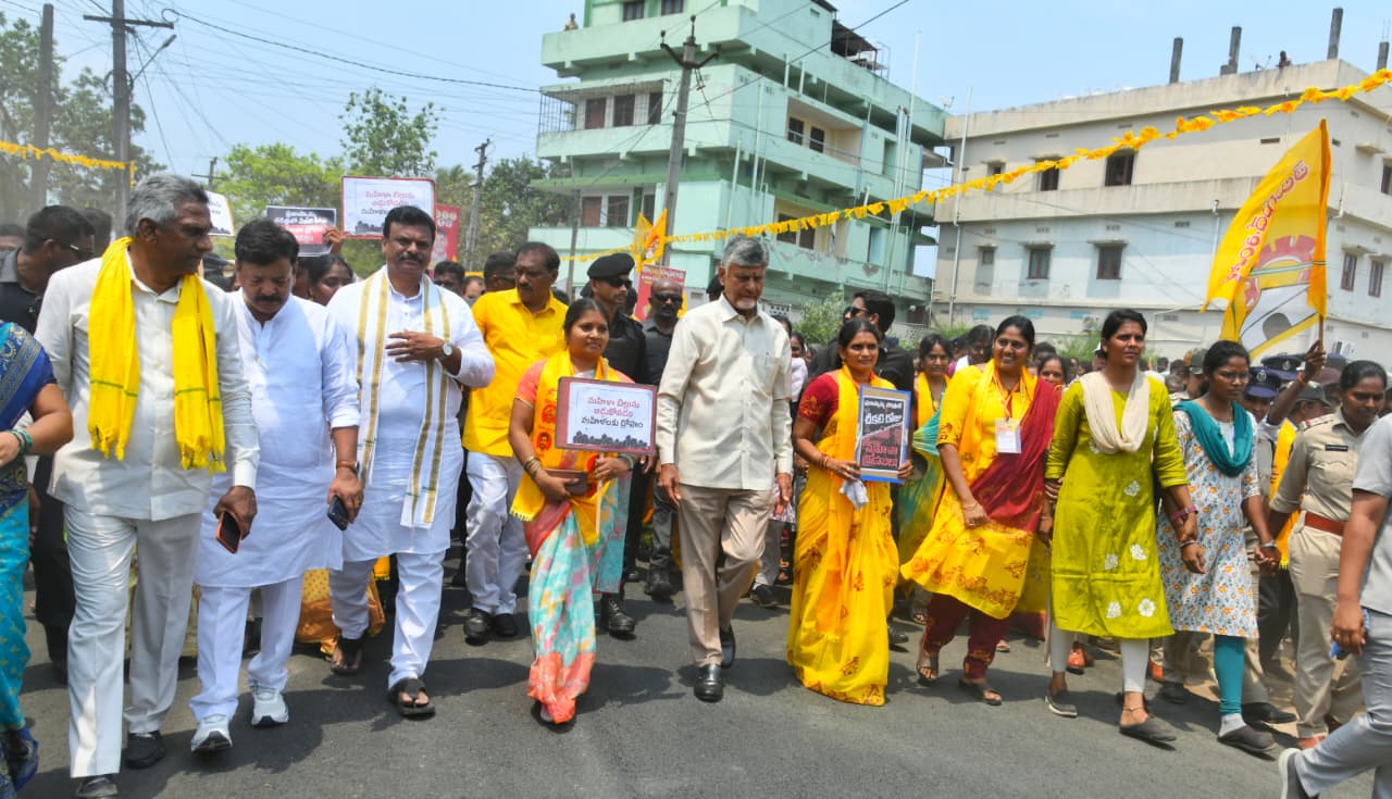 మహిళలు, జనసేన, బీజేపీ నేతలతో కలిసి జరిగిన ఈ నిరసనలో సీఎం స్వయంగా ప్లకార్డు పట్టుకుని పాల్గొన్నారు. మహిళా సాధికారతకు మద్దతుగా ఆయన తన అభిప్రాయాన్ని వ్యక్తం చేశారు.ఈ ర్యాలీలో మంత్రులు రామానాయుడు, కందుల దుర్గేష్, బీజేపీ రాష్ట్ర అధ్యక్షుడు మాధవ్ తదితరులు పాల్గొన్నారు.ప్రభుత్వం మహిళా రిజర్వేషన్కు కట్టుబడి ఉందని, బిల్లుకు మద్దతు కొనసాగిస్తామని ఈ సందర్భంగా నాయకులు తెలిపారు.