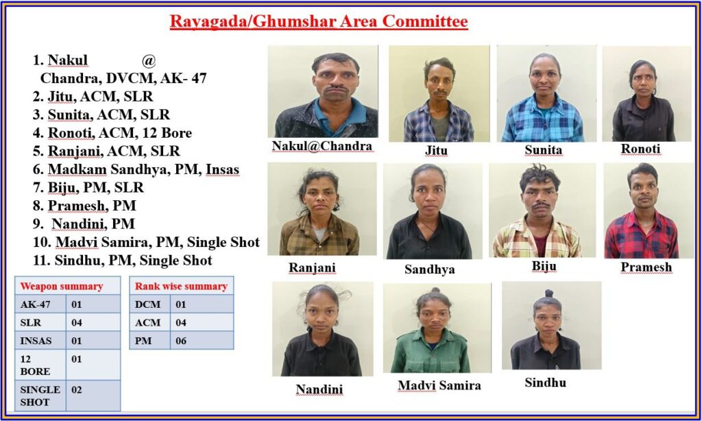 లొంగిపోయిన వారిలో ఐదుగురు ఏరియా కమిటీ సభ్యులు, ఐదుగురు పార్టీ క్యాడర్లు ఉన్నారు. వీరు ఒక AK-47, ఒక INSAS, నాలుగు SLR రైఫిళ్లు, నాలుగు సింగిల్ షాట్ తుపాకులు మరియు భారీ మందుగుండు సామాగ్రిని పోలీసులకు అప్పగించారు.మహారాష్ట్రకు చెందిన నకుల్ ఒడిశా రాష్ట్ర కమిటీలో డీసీఎంగా పనిచేస్తూ ఉండగా, అతనిపై రూ.22 లక్షల రివార్డు ఉన్నట్లు పోలీసులు తెలిపారు.