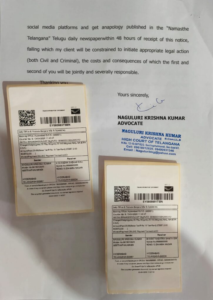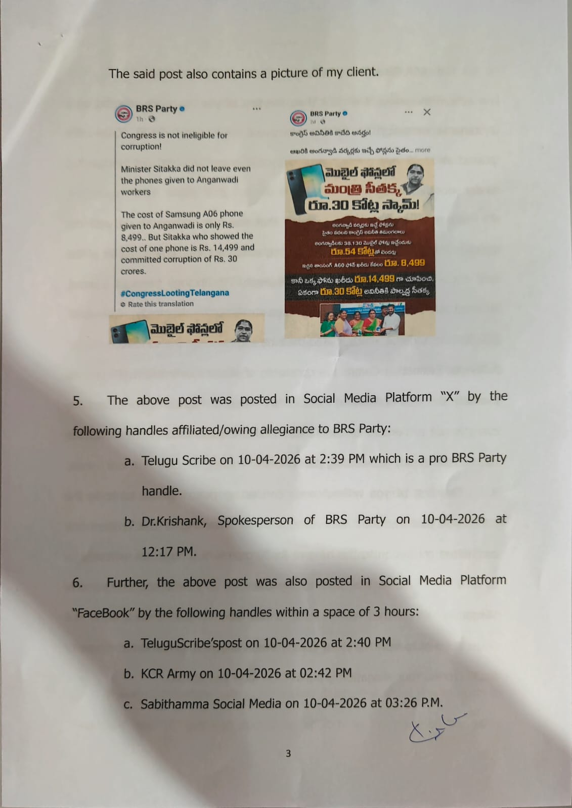 మొత్తం టెండర్ విలువ రూ.44 కోట్లు మాత్రమే ఉండగా, రూ.30 కోట్ల అవినీతి జరిగిందని ఆరోపించడం అసత్యమని మంత్రి సీతక్క పేర్కొన్నారు. బీఆర్ఎస్ పార్టీ అధికారిక సోషల్ మీడియా వేదికలపై జరుగుతున్న ప్రచారానికి కేసీఆర్ బాధ్యత వహించాలని డిమాండ్ చేశారు.48 గంటల్లో తప్పుడు పోస్టులు తొలగించి క్షమాపణ చెప్పాలని, లేకపోతే సివిల్, క్రిమినల్ చర్యలు తీసుకుంటామని నోటీసులో హెచ్చరించారు.
