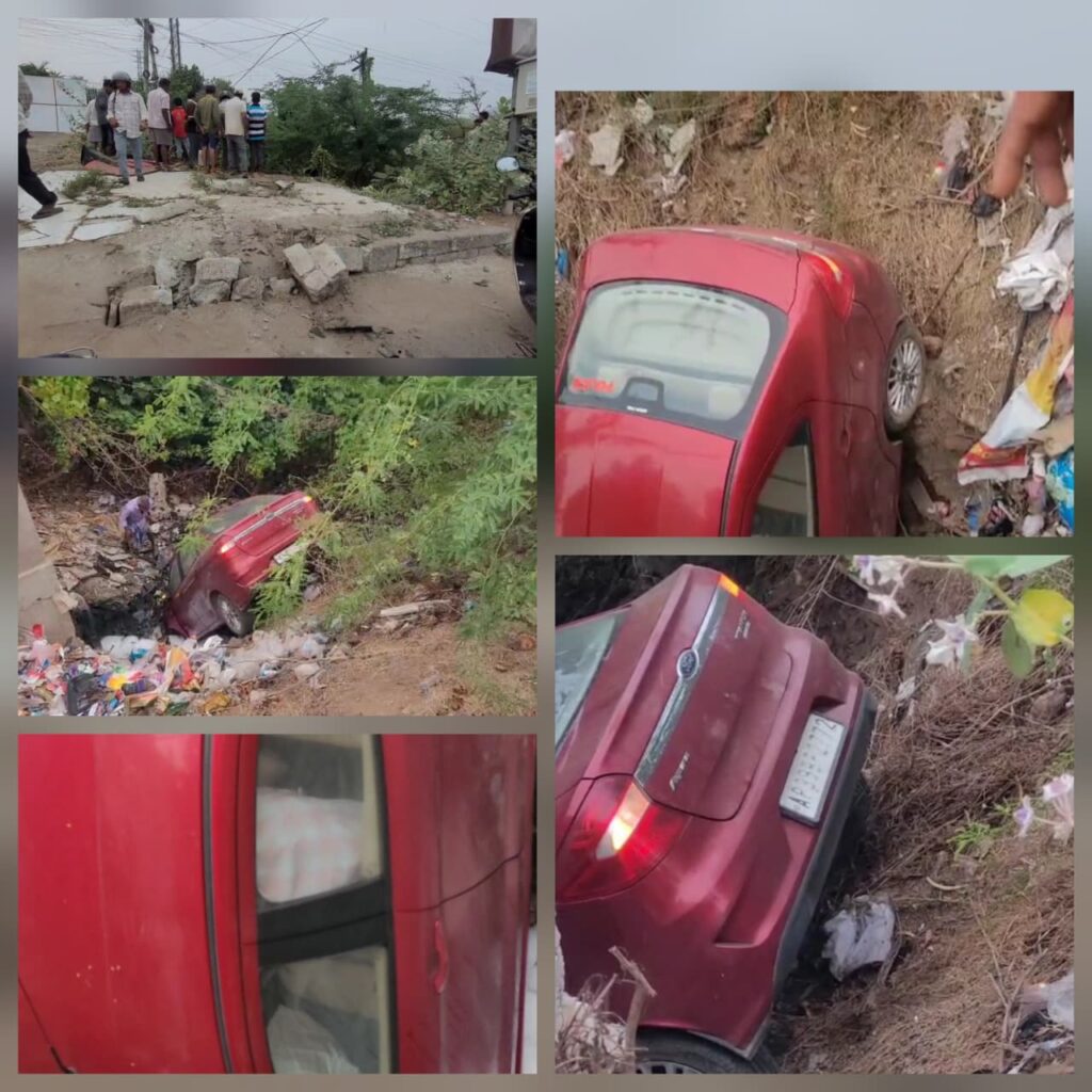 భరతమాత సెంటర్ వద్ద అదుపుతప్పిన కారు పక్కనే ఉన్న డ్రైనేజీలోకి దూసుకెళ్లింది. ఈ ఘటన ఉదయం సుమారు 5 గంటల సమయంలో జరిగింది.కారు ఎయిర్బ్యాగ్లు ఓపెన్ కావడంతో పెద్ద ప్రమాదం తప్పిందని స్థానికులు తెలిపారు. కారులో ఒక వ్యక్తి మాత్రమే ఉన్నట్టు సమాచారం.ఈ వాహనం పోలీస్ శాఖకు సంబంధించినదిగా అనుమానాలు వ్యక్తమవుతున్నాయి. ప్రమాదం అనంతరం డ్రైవర్ కారులో నుంచి బయటకు వచ్చి వెళ్లిపోయినట్టు సమాచారం.ఈ ఘటనపై పూర్తి వివరాలు తెలియాల్సి ఉంది.