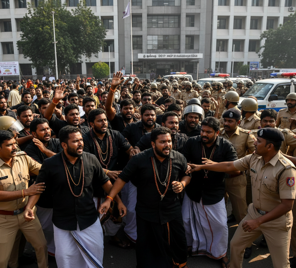 డీజీపీ కార్యాలయం లోపలికి వెళ్లేందుకు యత్నించిన అయ్యప్ప స్వాములను పోలీసులు అడ్డుకున్నారు. ఈ క్రమంలో పోలీసులకు, స్వాములకు మధ్య వాగ్వాదం మరియు తోపులాట జరిగింది.