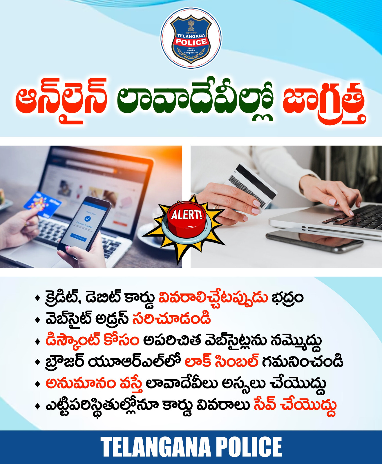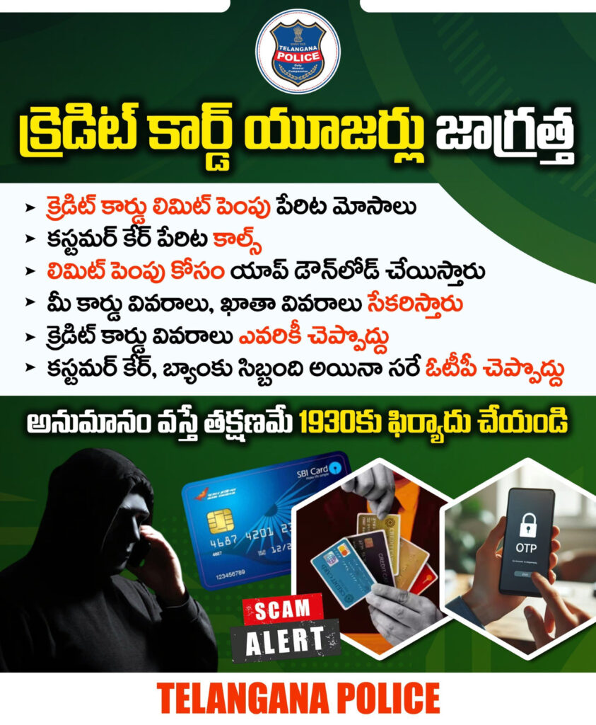 క్రెడిట్ కార్డ్ మోసాల పెరుగుతున్న ప్రమాదం గురించి హైదరాబాద్ సిటీ పోలీస్ సైబర్ క్రైమ్ శాఖ ప్రజలను హెచ్చరించింది. ఫిషింగ్, నకిలీ కస్టమర్ కేర్ కాల్స్, మాల్వేర్ యాప్లు వంటి వివిధ మార్గాల ద్వారా మోసగాళ్లు బాధితులను లక్ష్యంగా చేసుకుంటున్నారని డీసీపీ, సైబర్ క్రైమ్స్ తెలిపారు.