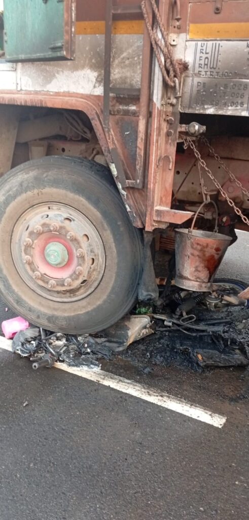 ఎదురుగా వస్తున్న స్కూటర్‌పైకి లారీ దూసుకురావడంతో ఈ ప్రమాదం సంభవించింది. లారీ చక్రాల కింద పడి మృతదేహాలు నుజ్జునుజ్జయ్యాయి. మృతుల వివరాలు ఇంకా తెలియాల్సి ఉంది. ప్రమాద తీవ్రతకు స్కూటర్ లారీ కింది భాగంలో ఇరుక్కుపోయింది. ఘర్షణ (Friction) కారణంగా లారీలో ఒక్కసారిగా మంటలు చెలరేగాయి. లారీలో మంటలు వ్యాపించడాన్ని గమనించిన స్థానికులు వెంటనే స్పందించి, నీటితో మంటలను అదుపు చేశారు. లేదంటే భారీ ప్రమాదం జరిగి ఉండేదని ప్రత్యక్ష సాక్షులు తెలిపారు.సమాచారం అందుకున్న పోలీసులు ఘటనా స్థలానికి చేరుకుని మృతదేహాలను పోస్టుమార్టం నిమిత్తం ఆసుపత్రికి తరలించారు. కేసు నమోదు చేసి దర్యాప్తు జరుపుతున్నారు.